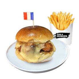 Tenders, fromage à raclette, bacon, oignons frits, oignons crispy, sauce burger.