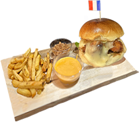 Tenders, fromage à raclette, bacon, oignons frit, oignons crispy, sauce burger.